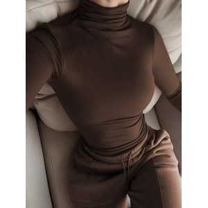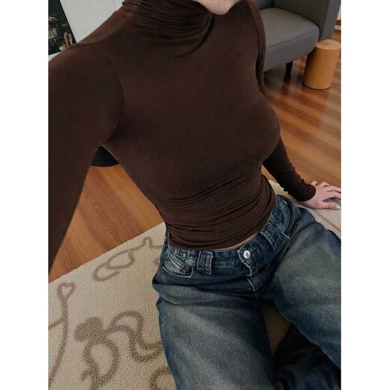 Maglia a collo alto marrone realizzata in tessuto elasticizzato e avvolgente, caratterizzata da una linea aderente che valorizza la silhouette. Perfetta da abbinare a jeans o pantaloni a vita alta, è un capo versatile ideale per look casual ma eleganti.