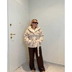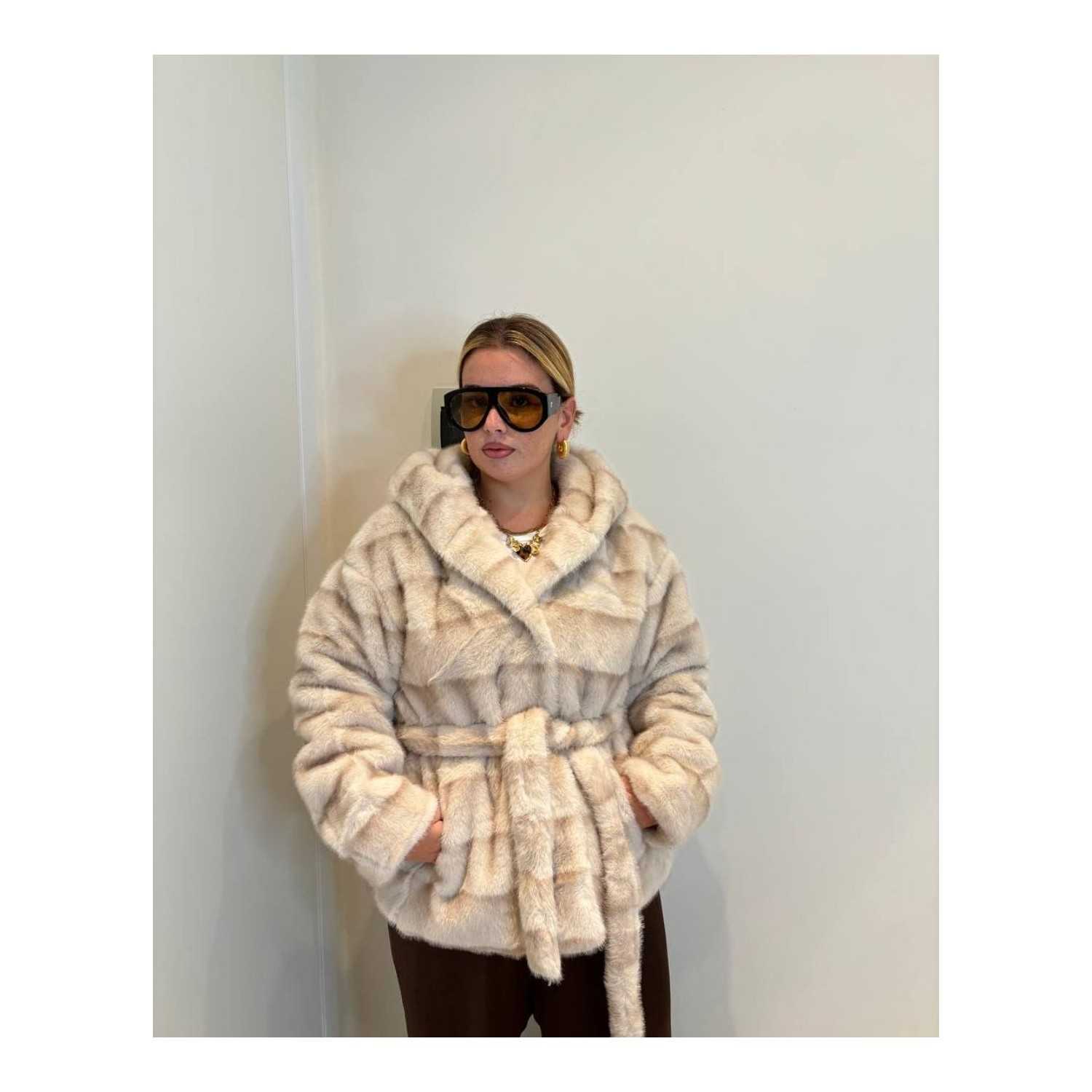 Avvolgente e sofisticata, questa eco-pelliccia beige offre calore e stile in ogni occasione. Il design con cappuccio, cintura in vita e texture soffice garantisce comfort e un look elegante e contemporaneo. Perfetta per completare outfit chic nelle giornate più fredde.