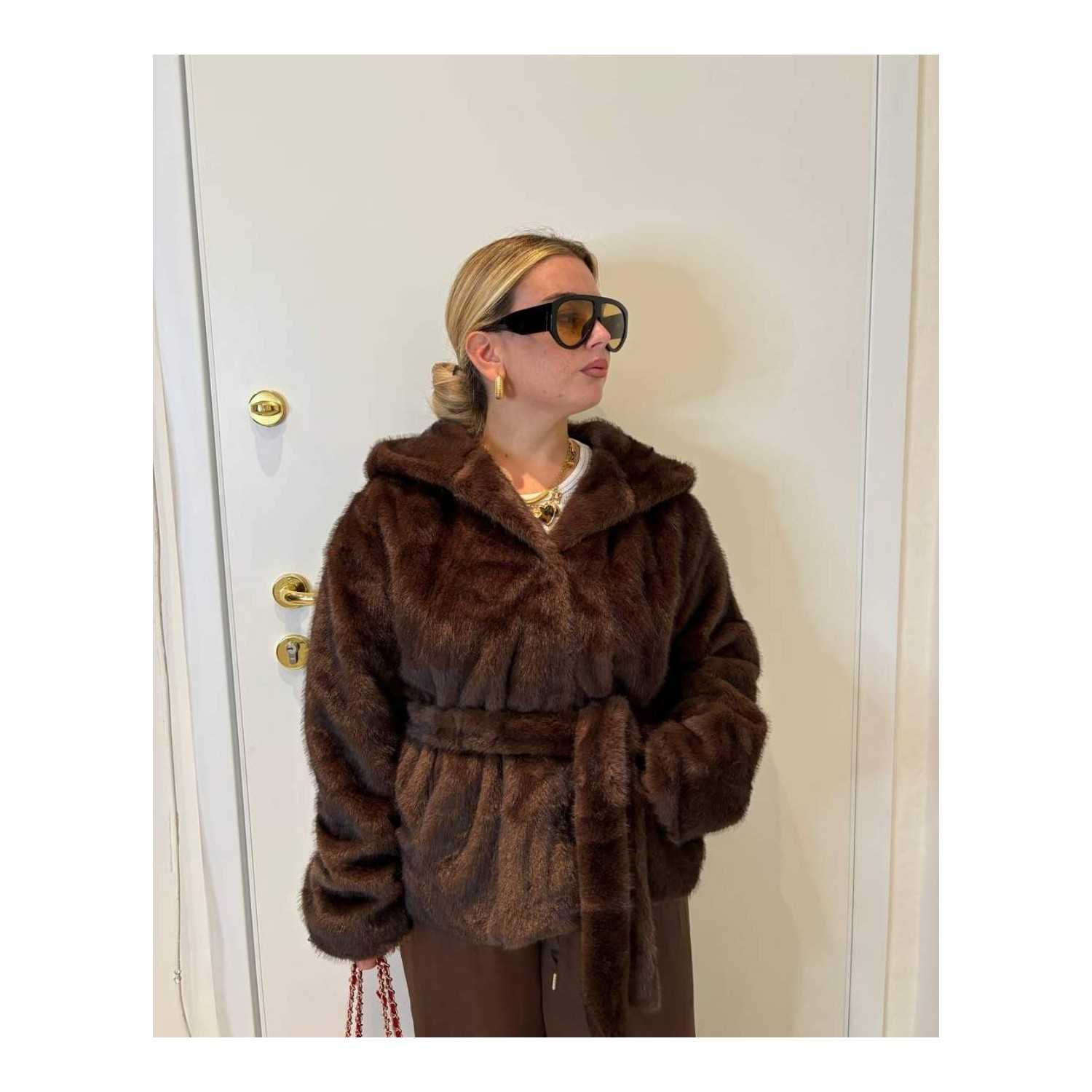 Ecopelliccia donna in morbida pelliccia sintetica color cioccolato, con cintura in vita e cappuccio. Calda, avvolgente e dal design elegante, perfetta per aggiungere un tocco di lusso ai look invernali.